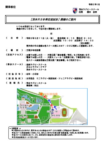 いつもお世話になっております。 2月11日交流戦のご案内・スケジュールを添付しておりますので御確認ください。 ◆幼年・低学年はタグラグビールールで行います。 ◆駐車場は東駐車場(有料)をご利用ください。 (少年野球場横の駐車場は登録された許可車のみ進入が許可されております。) ◆少年球技場内及び周辺歩道も全面禁煙です。タバコはお控え下さい。 ご不便をおかけいたしますがご理解、ご協力をお願いします。 ご意見ご質問がございましたらお気軽にお問い合わせください。 宜しくお願い申し上げます。