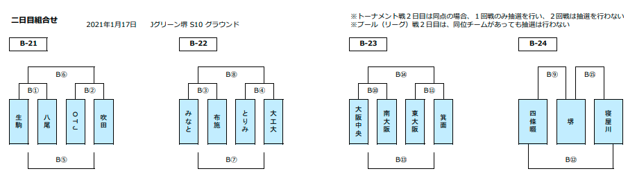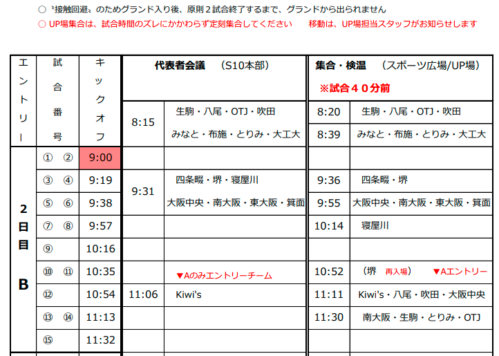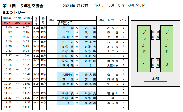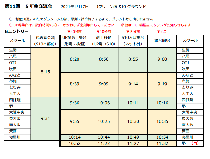 第11回5年生交流会 参加チーム各位 2日目の組み合わせ、その他資料を添付させて頂きます。 1日目棄権の茨木A、寝屋川A/B、堺A/Bのエントリー追加がありました。 ・Jグリーン堺の試合会場がS10へ変更となりました。 「Jグリーン堺_S10(試合会場)」資料をご確認頂き、注意事項も厳守願います。 アップ場からS10グランドは少し距離がありますので添付資料をご確認頂き、時間管理をお願いします。 アップ場の入口付近でコロナ検問所を設けますので所定の時間に選手・コーチ・撮影者は集合をお願いします。 撮影者については1日目同様にチーム同行でお願いします。 撮影者のネームプレートはグランド入場時にグランド本部でお渡しします。 ・検温時37.5℃以上、咳が酷いなど風邪の症状がある場合は入場はお断りさせて頂きます。 ・試合グランド入場時はグランド入口で再度消毒をお願いします。 ・基本は2試合終了後にグランドから退場となります。 グランド内のアップスペースは狭いですので、体が冷えない程度に譲り合ってアップを行って下さい。 1試合後に一旦グランドから退場して頂くチームもございますので、資料で自チームをご確認下さい。 ・A/Bの2チームエントリー>1日目同様にアップ場、グランドに入れるのは当該試合の選手のみです。 Aの試合でB選手が一緒にアップは出来ません、試合グランドに入る事も出来ません。(逆も同じ) ・代表者会議は所定の時間にS10グランド本部まで起こし下さい。 ・待機場所は密にならない様に配慮願います。 ・来場者リストは検問所で提出して頂きますので忘れずご持参ください。 ・不明な点がございましたらご連絡お願いします。